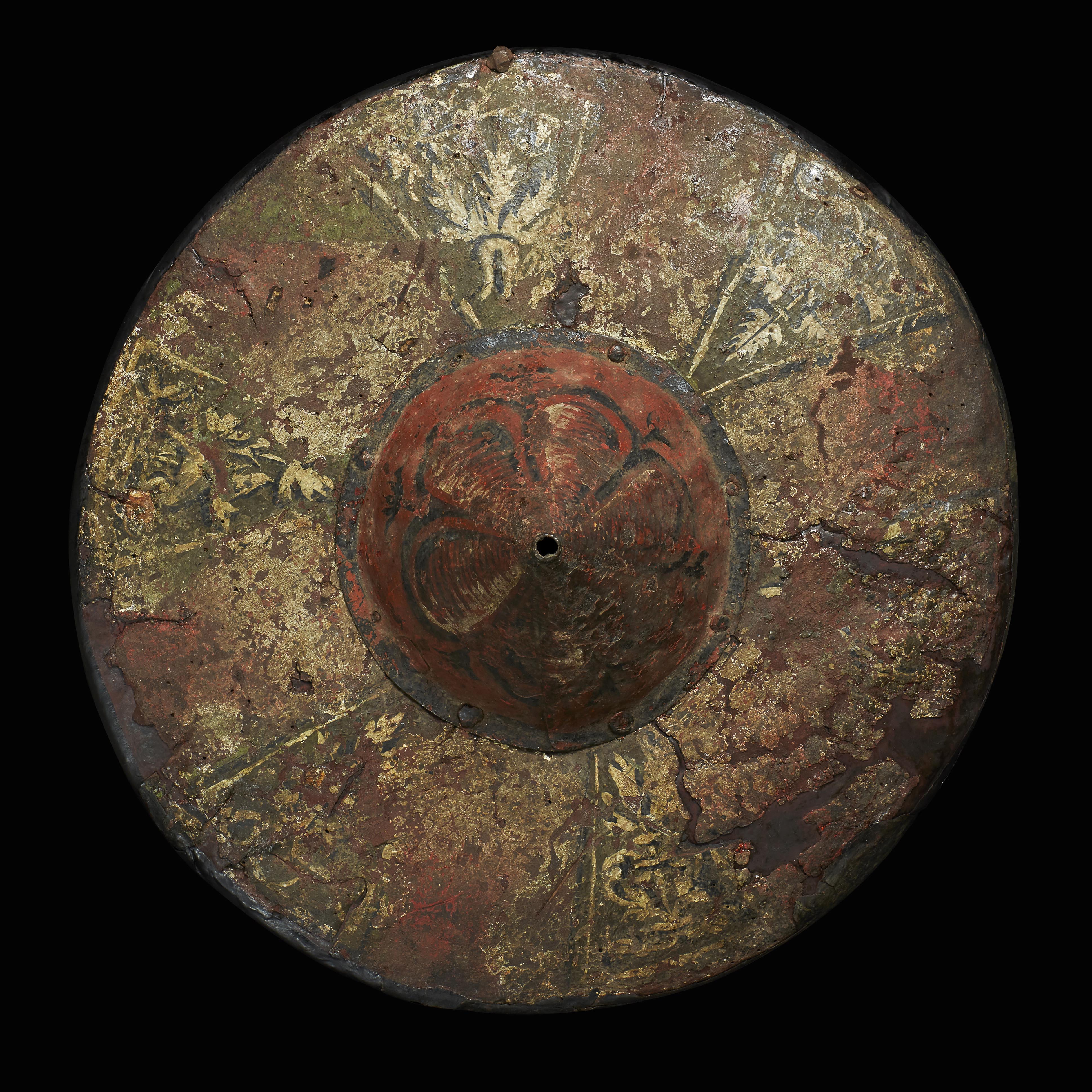 The corpus of this buckler is made of wood, its surface being abraded in order to facilitate the adhesion of an applied layer of feazed sinews. In the centre a forged