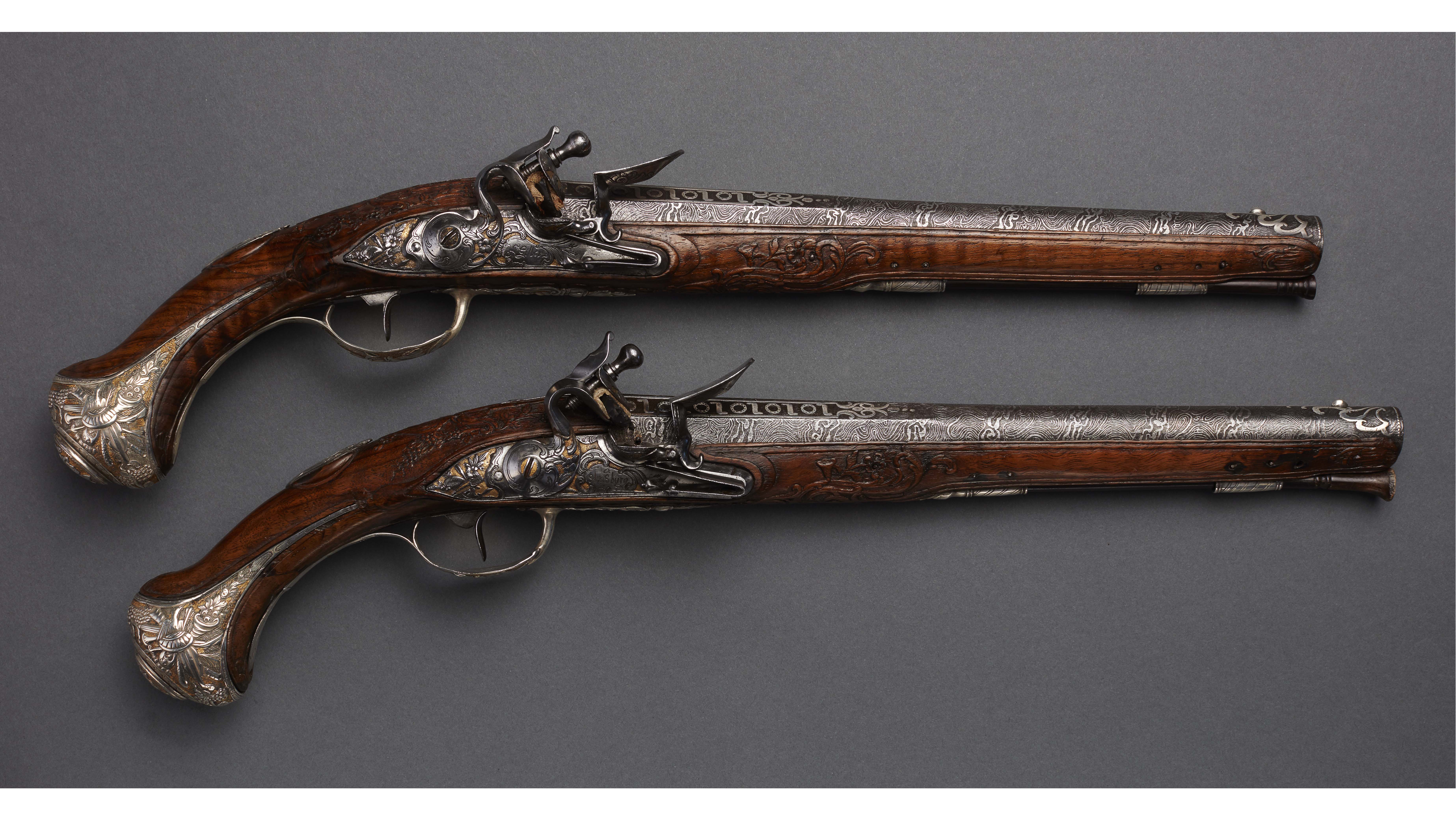 Full stocks of walnut, carved in relief showing foliate scrolls and bunches of