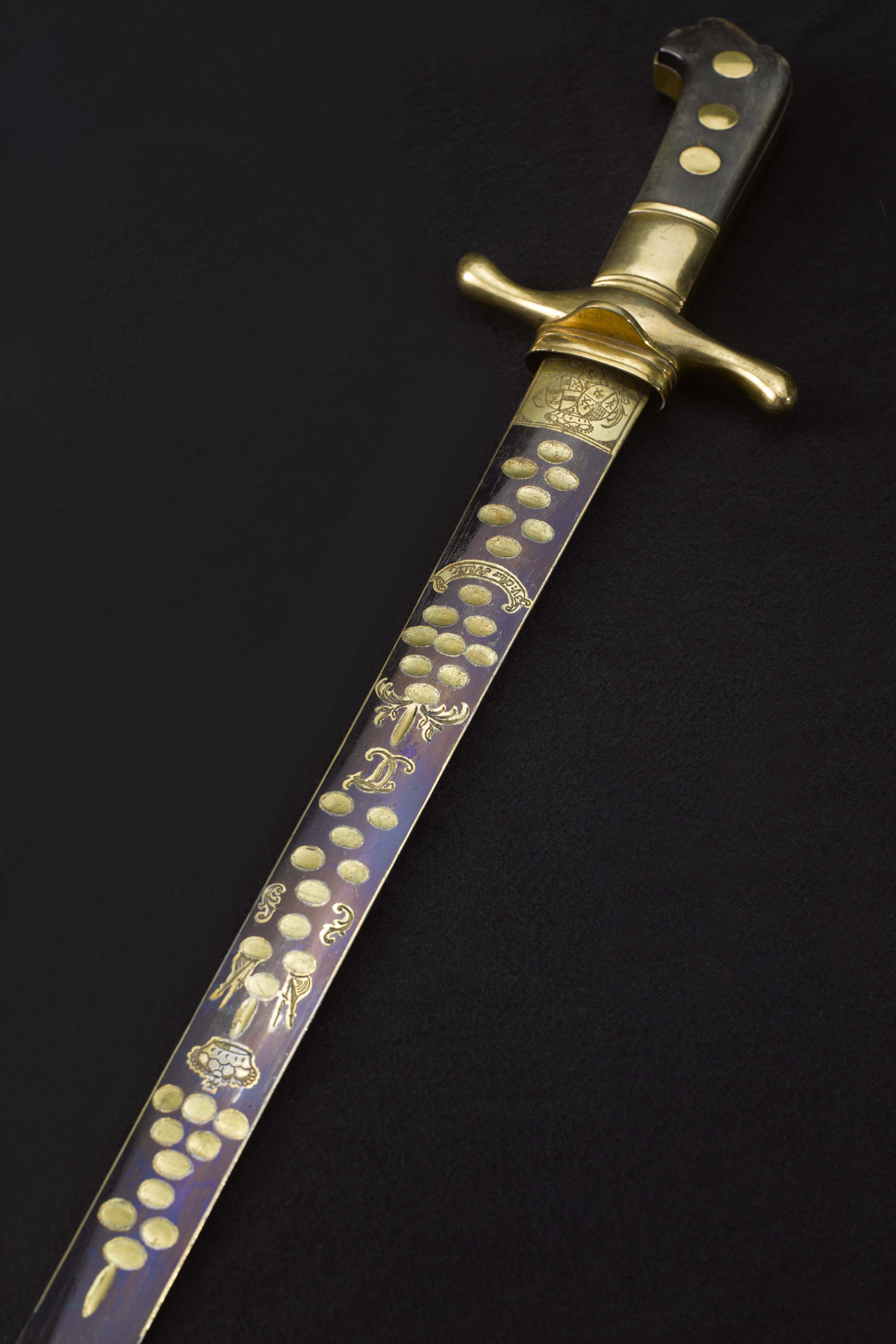 Straight double-edged blade with a ground ball-decor. The lower half engraved with a gilt decoration against a blued ground on each side, including trophies,