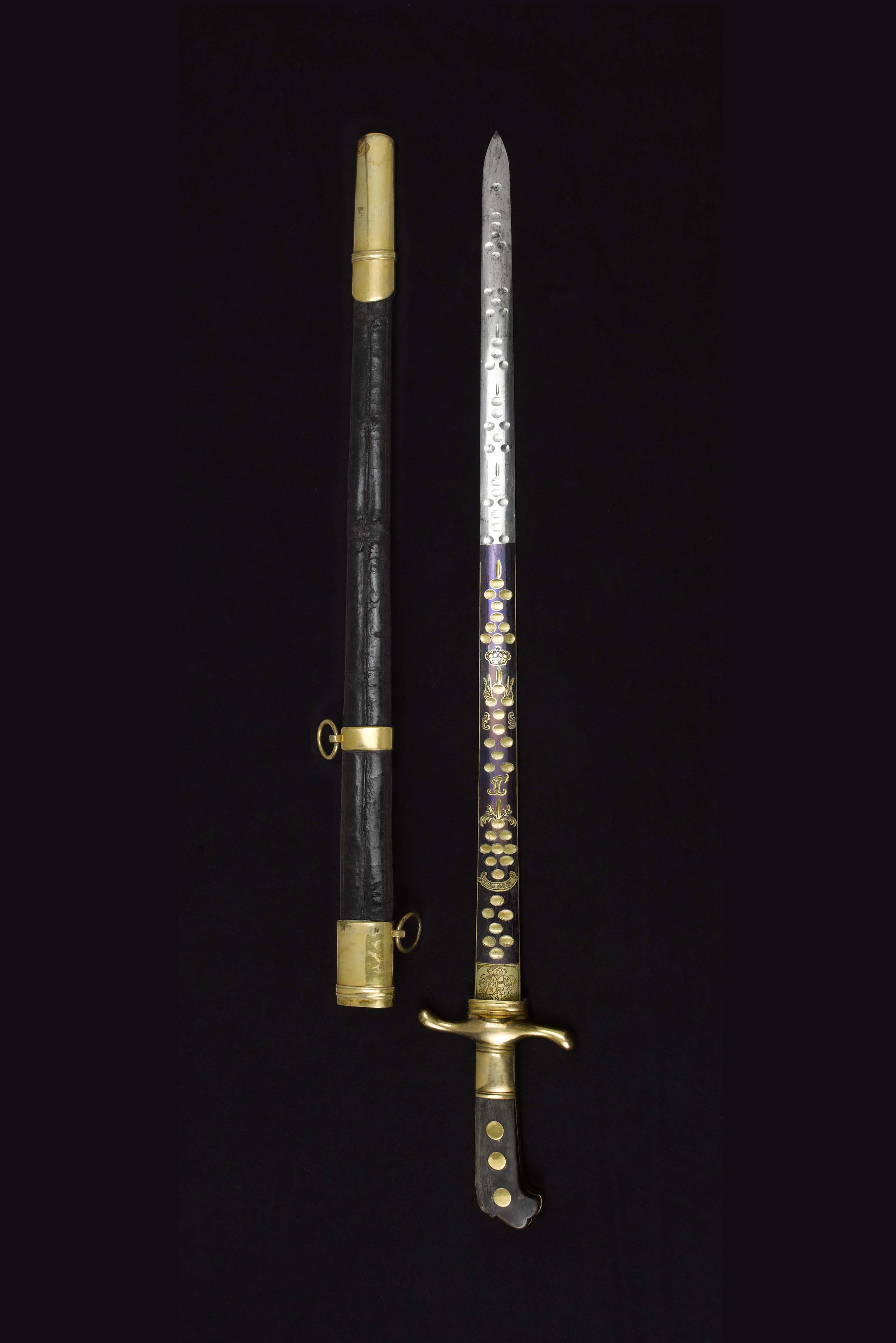 Original leather-covered wooden scabbard (restored) with two rings for suspension. Gilt-bronze mounts and a side-pocket for a by-knife (missing).