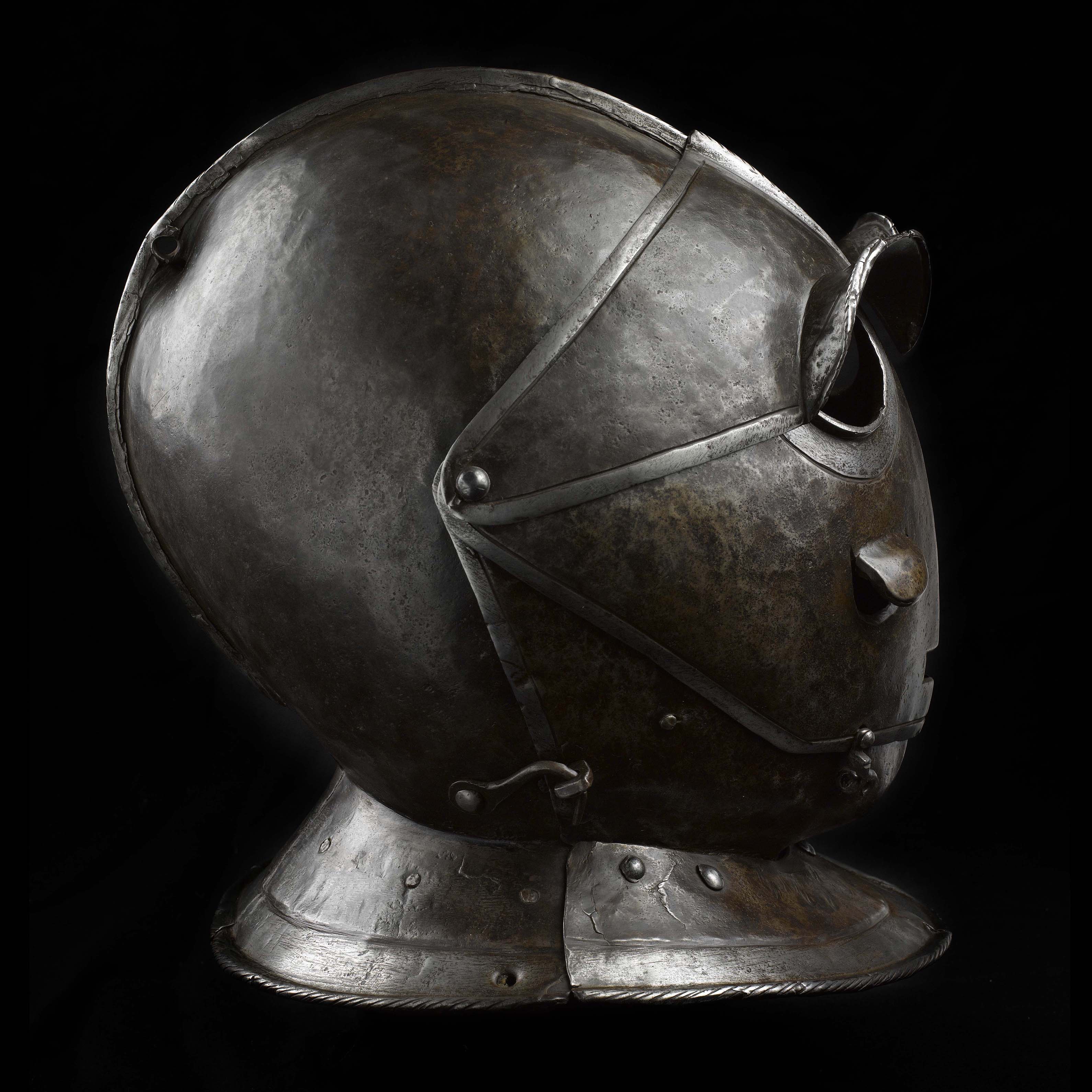 The plates of this savoyard helmet were forged in a material thickness that protected against contemporary fire arms. However this meant the weight to